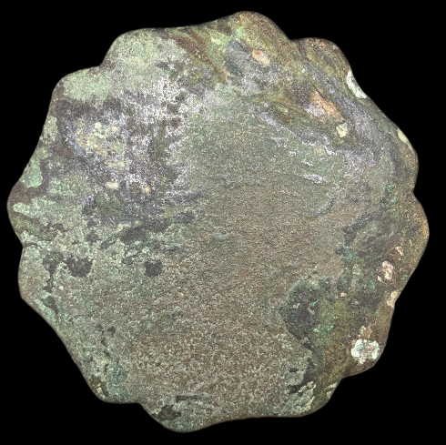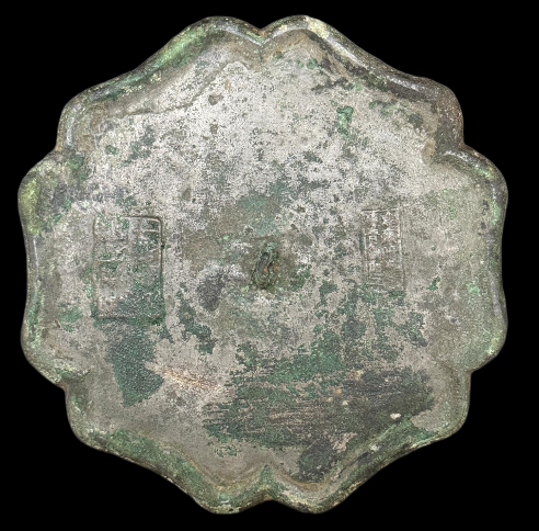 這是一面宋代湖州葵花形青銅鏡,屬于中國古代銅鏡中的經典品類,采用宋代流行的葵花形(菱花形) 邊緣,花瓣輪廓流暢自然,是宋代銅鏡 “追求典雅造型” 的典型體現。鏡身帶有兩處長方形銘文框(雖因銹蝕部分模糊,但屬于湖州鏡 “商標式銘文” 的典型布局)。宋代湖州鏡以 “品牌化鑄造” 聞名,常見 “湖州真石家念二叔照子”“湖州石十五郎真煉銅照子” 等銘文,既是工匠的 “品牌標識”,也反映當時民間鑄鏡業的商業化運作。