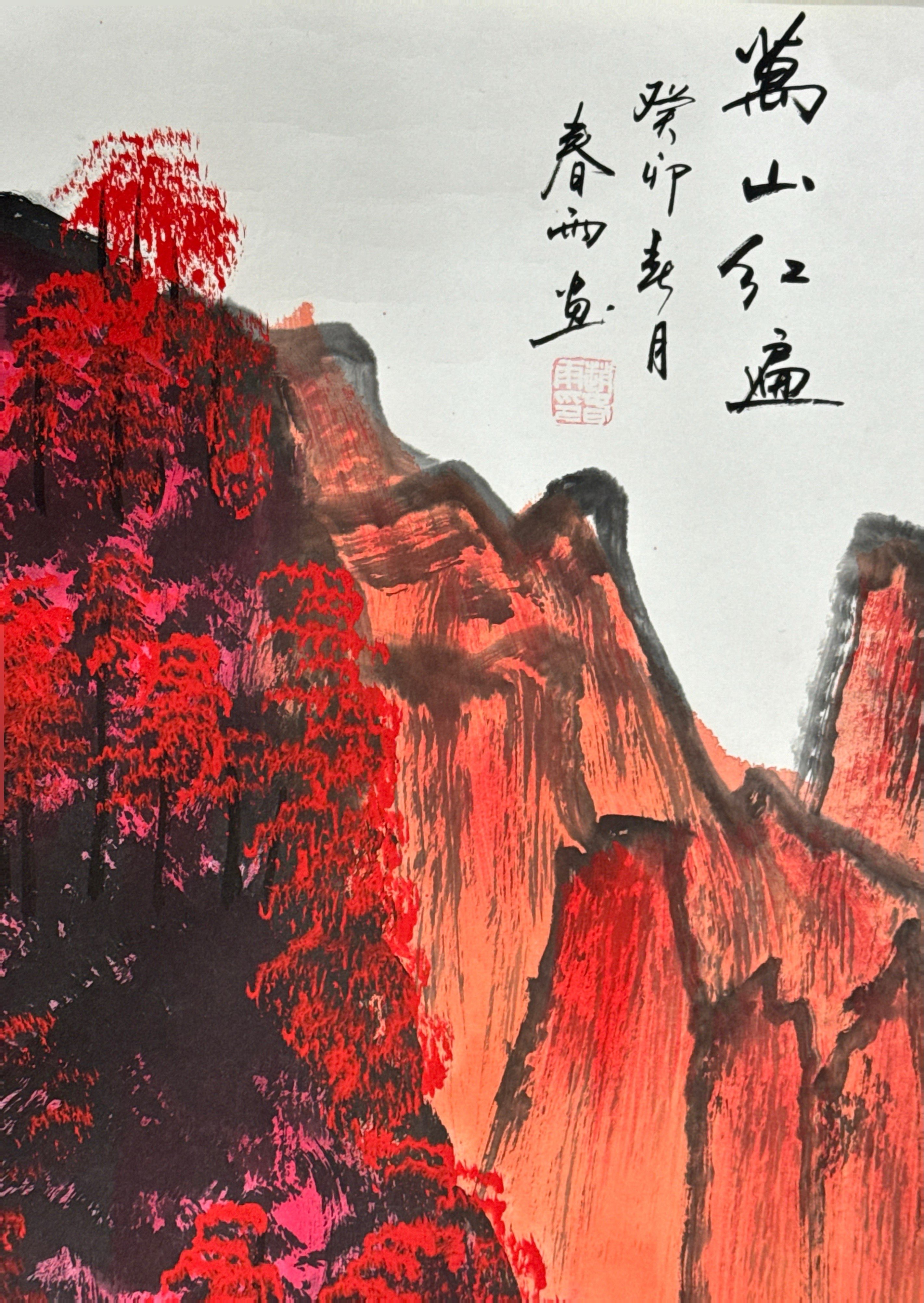 這是趙春雨創作的《萬山紅遍》國畫作品,在技法、構圖與意境表達上極具特色。
