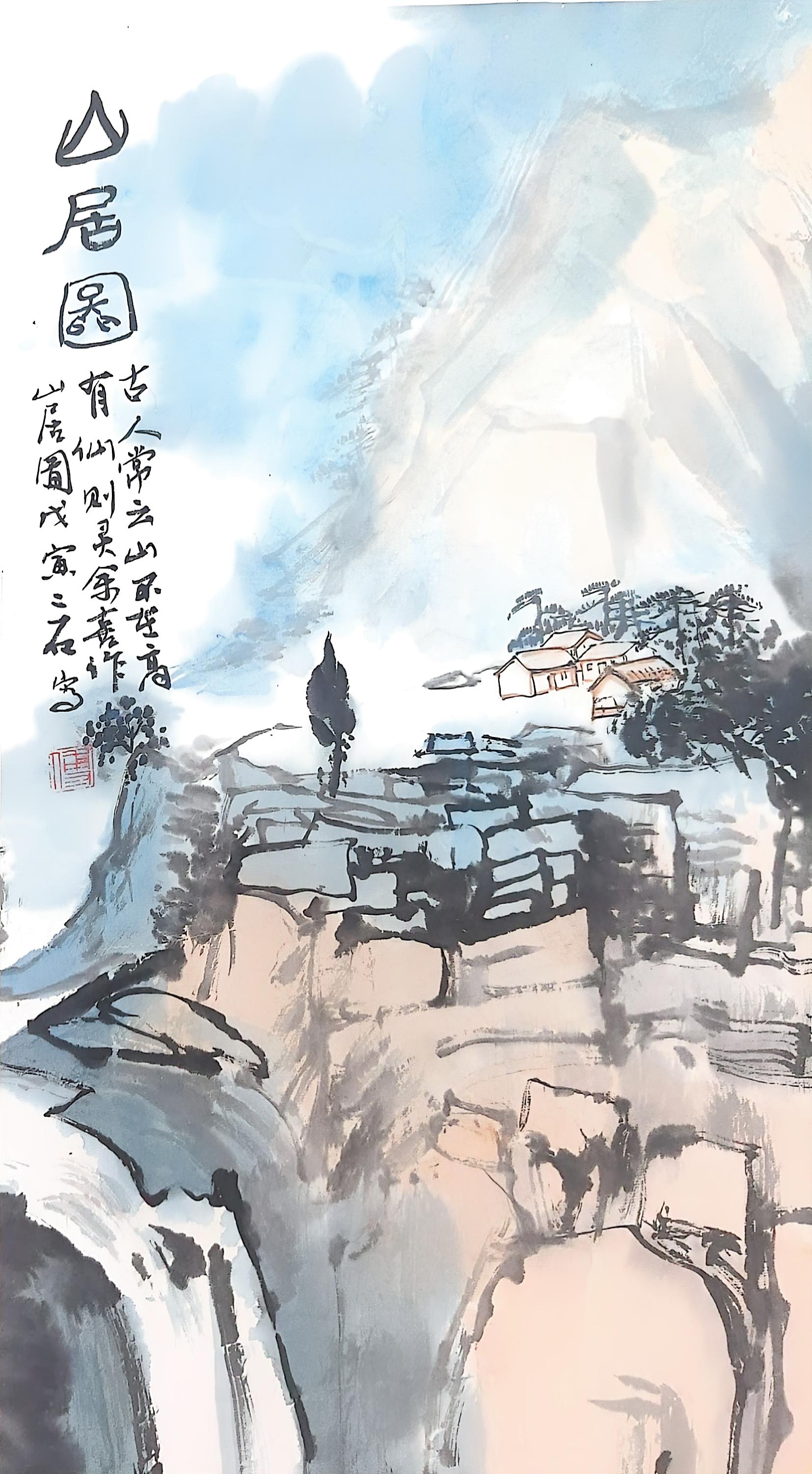 96cm的縱向尺幅,讓飛流瀑布的垂落之勢(shì)更顯舒展:水墨為骨,焦墨皴擦勾出崖壁嶙峋質(zhì)感;淡彩為韻,赭石與淺藍(lán)暈染出山石溫厚肌理,留白襯出瀑布的泠泠動(dòng)感,崖畔屋舍隱于松枝后,恰應(yīng)題跋“山不在高,有仙則靈”的意趣,將文人隱逸的山居理想落于筆端。43cm的橫向?qū)挾龋菹律绞膶盈B層次,立軸制式既契合傳統(tǒng)書(shū)畫(huà)的陳設(shè)審美,又便于近觀細(xì)節(jié):題款行書(shū)清雋,與寫(xiě)意筆觸相映,朱紅印章點(diǎn)睛出書(shū)畫(huà)合璧的雅趣。傅二石以“新水墨”輕淡色調(diào),消解了傳統(tǒng)山水的濃重,讓“山居”從古意符號(hào)化為可觸的林泉逸境。