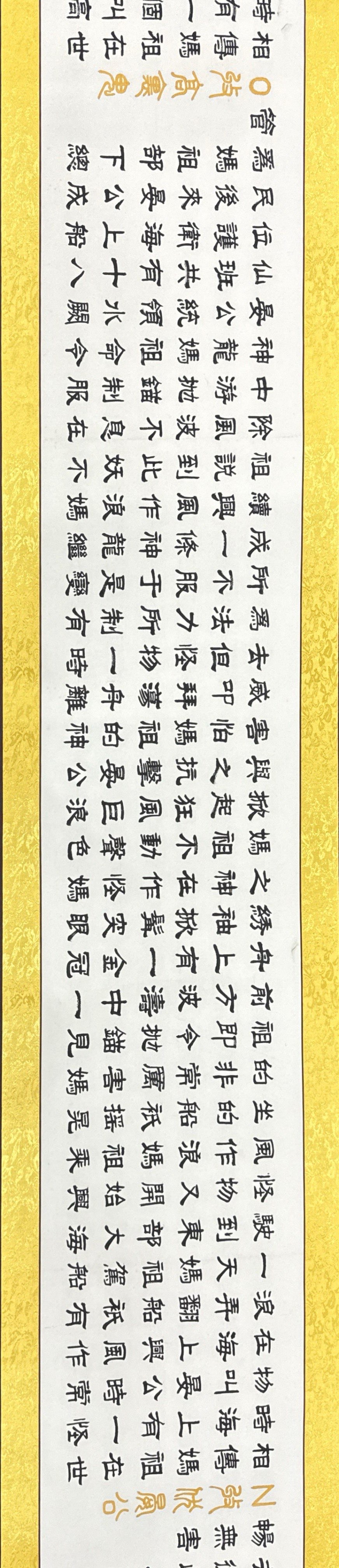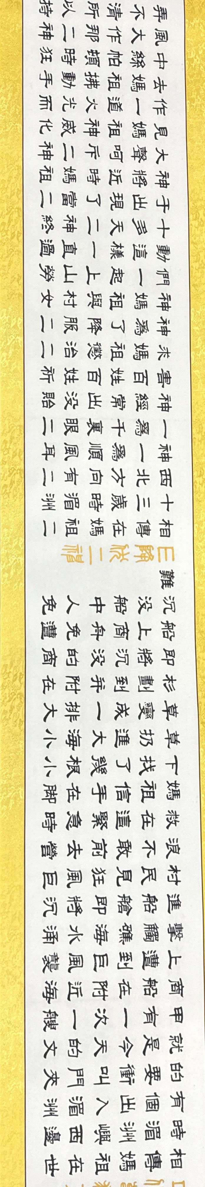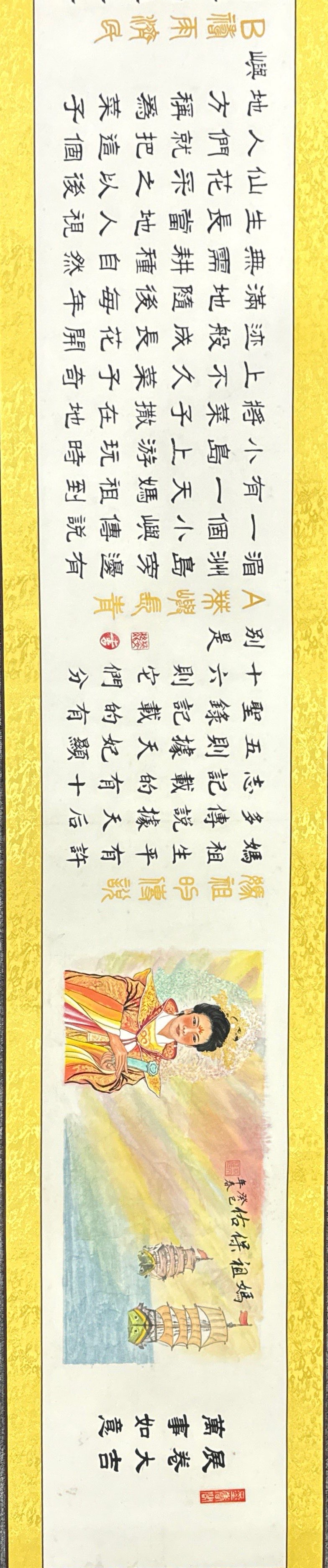 長(zhǎng)卷是78歲高齡的中國(guó)書(shū)畫(huà)藝術(shù)名家林文樵老先生2013年創(chuàng)作完成的,是中國(guó)四體書(shū)法和人物山水花鳥(niǎo)繪畫(huà)語(yǔ)言形式合而為一的完美組合。作品已經(jīng)精裱、品相完好無(wú)暇,長(zhǎng)39.70米寬0.44米近160平尺。題為《媽祖保佑》,5000多字內(nèi)容涵蓋和囊括了媽祖現(xiàn)有的34則生平故事和神話傳說(shuō)。全卷中間的畫(huà)心僅是一張完整宣紙,書(shū)畫(huà)家以嫻熟駕馭筆墨的技能和深厚的書(shū)畫(huà)功底,無(wú)一漏字漏劃也無(wú)誤敗之筆,畫(huà)心無(wú)一片拼接或破損!卷末創(chuàng)作中國(guó)水墨畫(huà)《竹報(bào)平安》。
