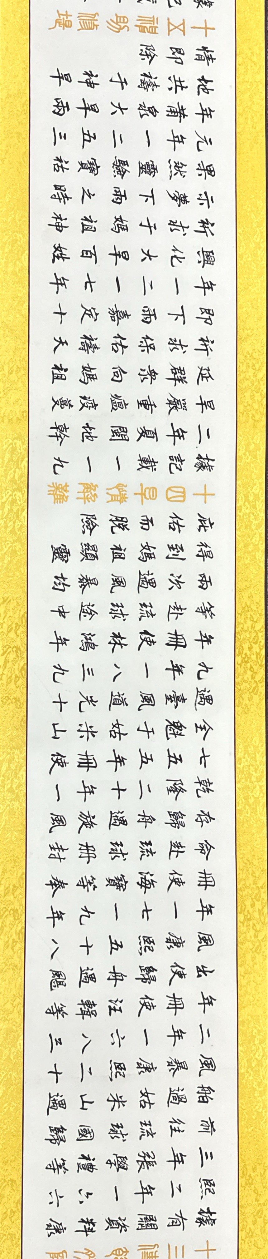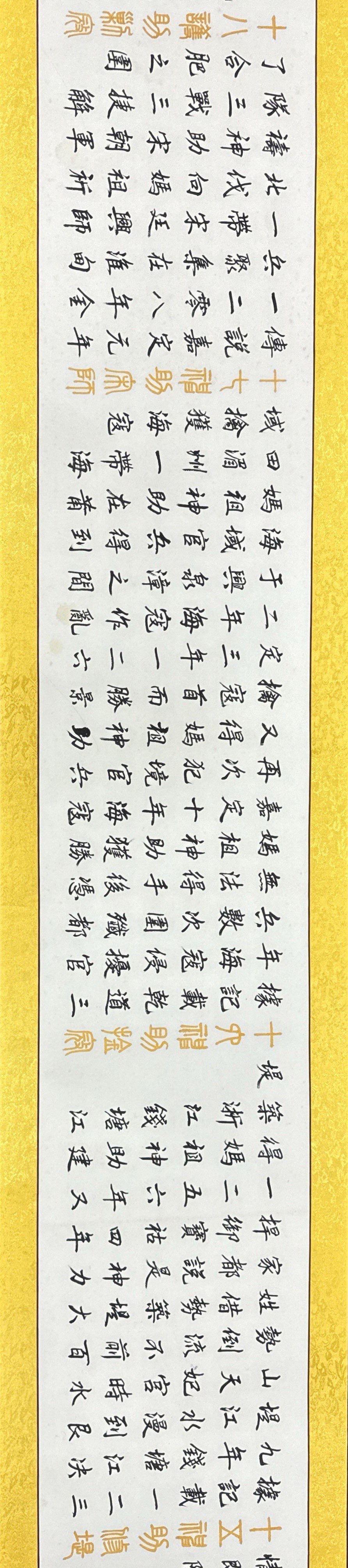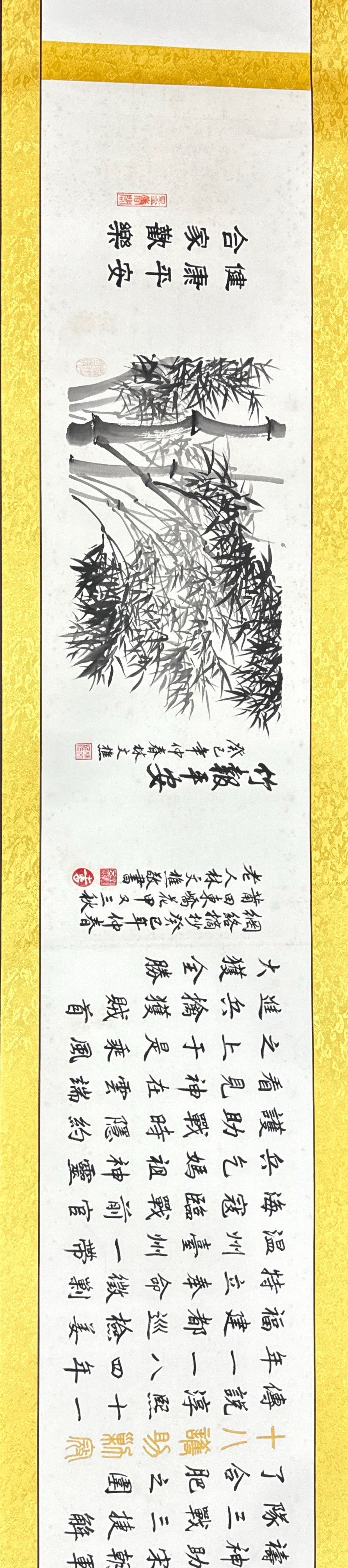 長(zhǎng)卷是78歲高齡的中國(guó)書(shū)畫(huà)藝術(shù)名家林文樵老先生2013年創(chuàng)作完成的,是中國(guó)四體書(shū)法和人物山水花鳥(niǎo)繪畫(huà)語(yǔ)言形式合而為一的完美組合。作品已經(jīng)精裱、品相完好無(wú)暇,長(zhǎng)39.70米寬0.44米近160平尺。題為《媽祖保佑》,5000多字內(nèi)容涵蓋和囊括了媽祖現(xiàn)有的34則生平故事和神話傳說(shuō)。全卷中間的畫(huà)心僅是一張完整宣紙,書(shū)畫(huà)家以嫻熟駕馭筆墨的技能和深厚的書(shū)畫(huà)功底,無(wú)一漏字漏劃也無(wú)誤敗之筆,畫(huà)心無(wú)一片拼接或破損!卷末創(chuàng)作中國(guó)水墨畫(huà)《竹報(bào)平安》。