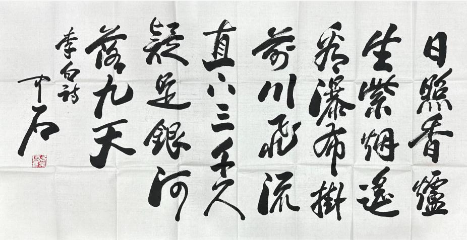 作品以行書書體書寫唐代詩人李白的《望廬山瀑布》,字體風格兼具楷書的端莊與草書的靈動,筆畫粗細變化自然,提按轉折間盡顯功力。每個字的結構布局精妙,或欹或正,疏密得當,如“日”“照”“香”等字端莊大氣,“飛”“流”“直”等字則靈動灑脫,整體氣韻連貫,將詩歌中瀑布的磅礴氣勢與浪漫想象通過書法的筆墨語言生動呈現。