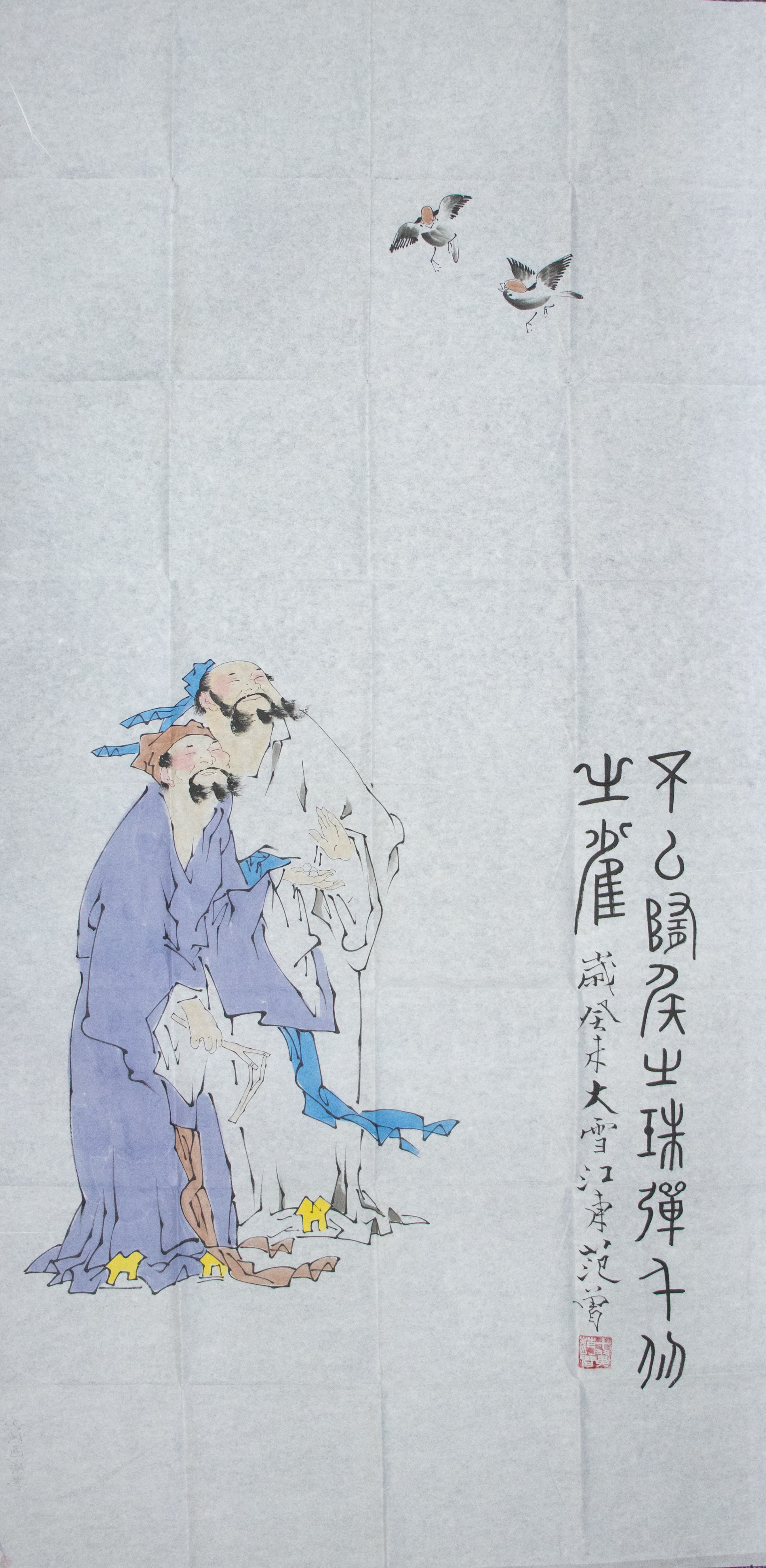 上方點綴兩只飛鳥,姿態(tài)輕盈,與下方的人物形成動靜呼應,增添了畫面的生機與意趣。右側的題款書法風格古樸,字體為范曾擅長的篆隸結合體,筆畫蒼勁有力,與畫面的筆墨風格相得益彰,題款內容與紅色印章的融入,不僅明確了創(chuàng)作信息,還為作品增添了文化韻味與形式美感。