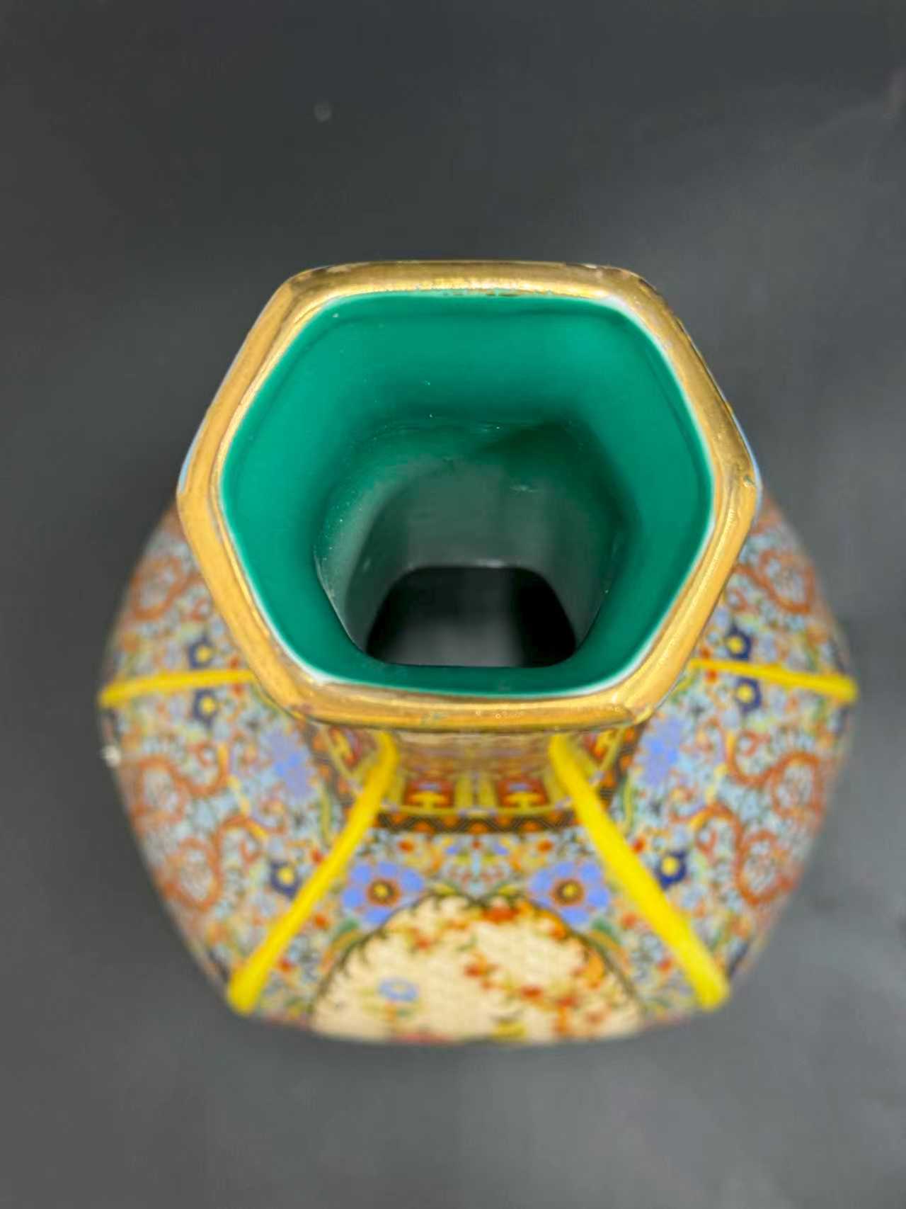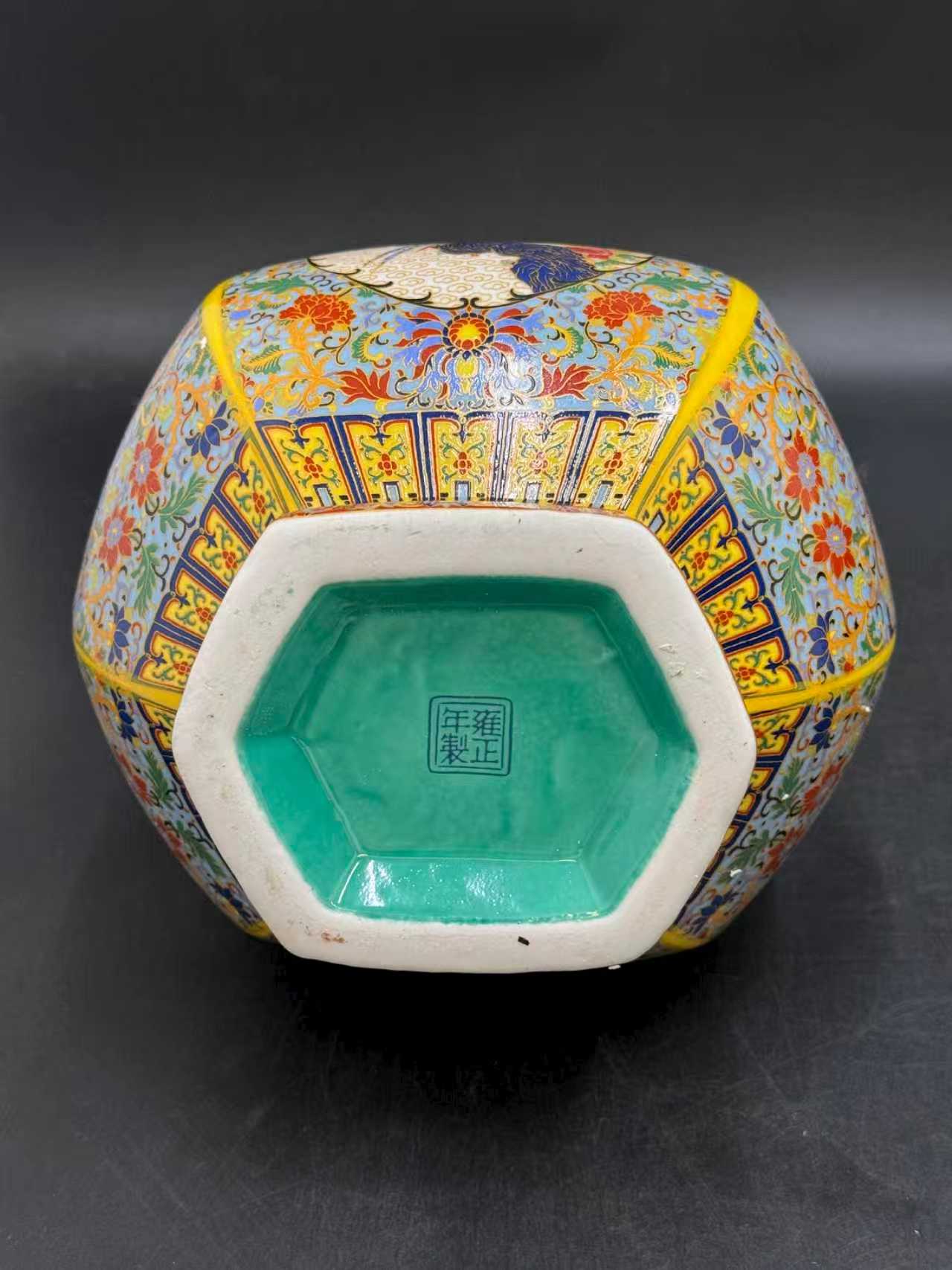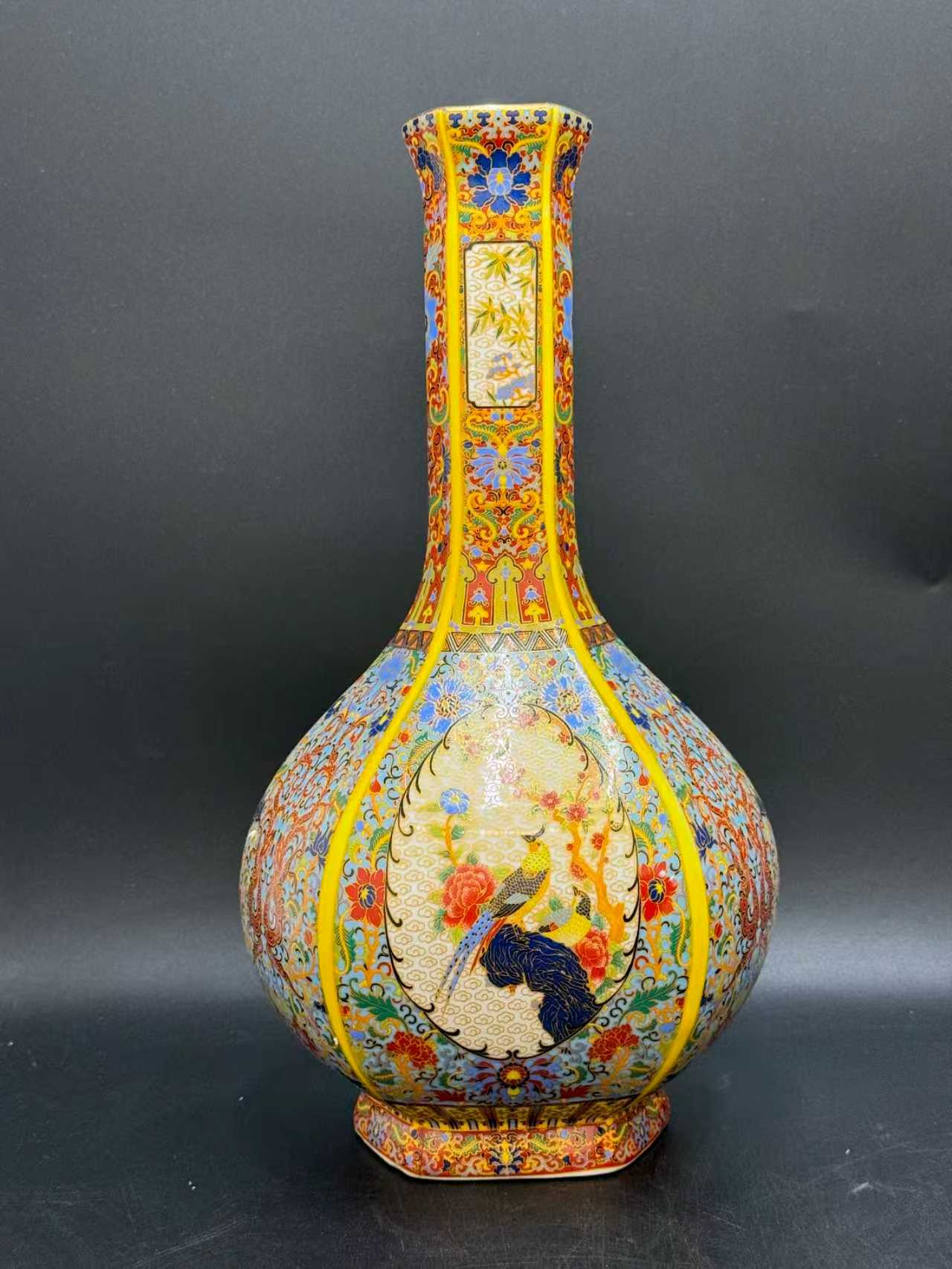 瓶身六方造型,棱角分明卻不失柔美,是雍正朝對 “規矩中見靈動” 審美的絕佳詮釋。其上琺瑯彩紋飾極盡奢華:錦地開光內,花鳥圖工筆細膩,雀鳥翎羽、花卉紋理分毫畢現;邊角纏枝紋色彩濃艷卻層次清晰,金彩勾勒的線條熠熠生輝,完美復刻了雍正琺瑯彩 “彩料凝重、畫工精細” 的特質。