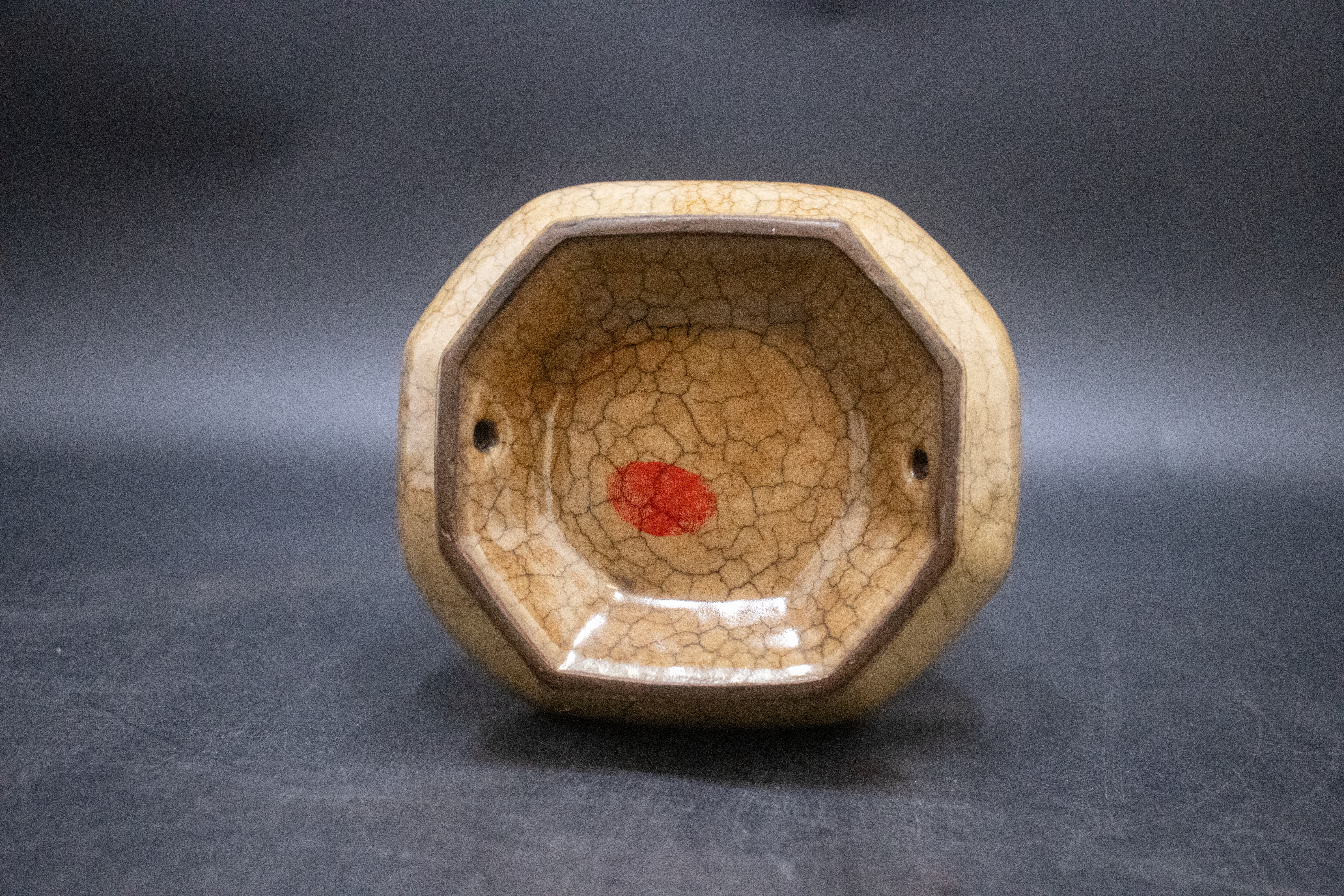 哥窯米黃釉屬于失透的乳濁釉,釉色純正如玉米黃,柔潤似玉,是宋代哥窯的典型釉色之一。釉層較薄,但質感豐厚,呈現 “酥油光”,這是后世仿品難以復刻的關鍵特征。里外施釉,底足內亦施釉,釉面平整光潤,口沿處偶有釉水微淌形成的 “游泳圈” 狀堆積,為哥窯器的獨特標識。