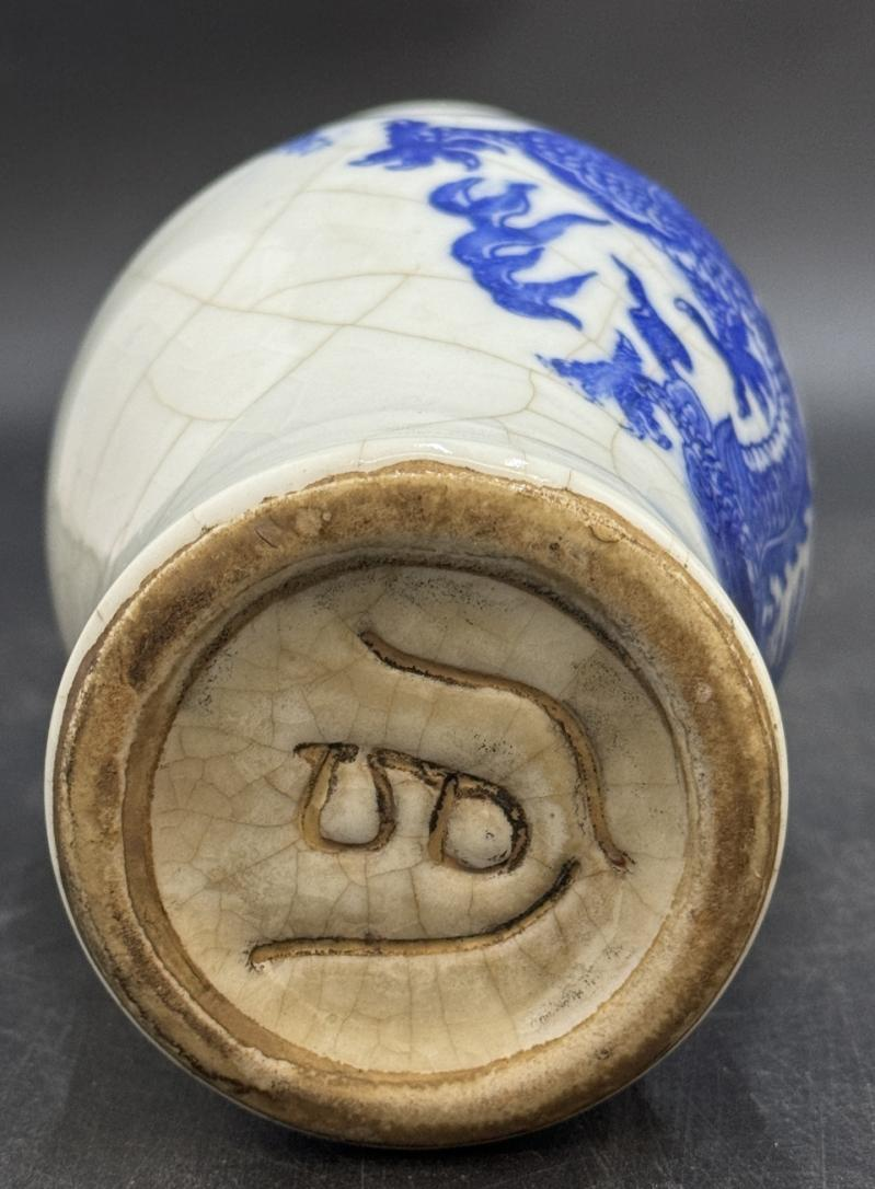 瓶身五爪龍紋(若細節符合)是明代皇權的象征,龍姿矯健、氣勢威嚴,既體現 “帝王馭宇” 的權威意象,又暗含 “龍騰四海、國泰民安” 的祥瑞祈愿;龍紋與開片釉的結合,將 “皇家威儀” 與 “古典雅致” 融為一體,是明代陶瓷 “紋飾載道” 文化的鮮活載體。底部 “官” 字款是明代官用瓷或官窯制式的直接標識,說明其在明代瓷業體系中具有 “官方屬性”,是研究明代官瓷制度、工藝分工的重要實物;此類款識器物存世稀少,其 “身份性” 與 “稀缺性” 進一步凸顯了收藏與研究價值。
