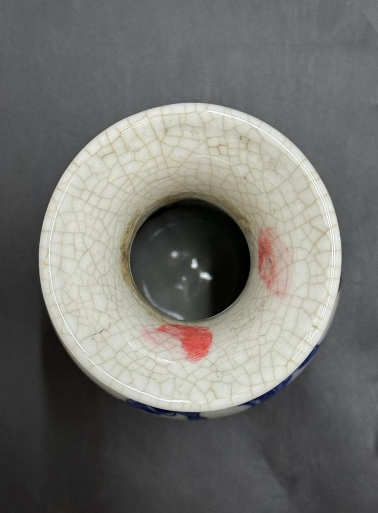 工藝巔峰青花與開片的雙絕演繹,青花工藝采用明代優質鈷料繪制龍紋,發色濃艷深沉,龍紋鱗片、云氣的筆觸蒼勁有力,盡顯明代青花 “一筆點染” 的工藝精髓,是明代青花 “紋飾立體、氣韻生動” 風格的絕佳體現。開片工藝釉面開片自然古樸,呈 “金絲鐵線” 之態,是對宋代哥窯開片技藝的明代傳承與創新,開片紋理與青花龍紋形成 “剛柔相濟” 的視覺張力,工藝復雜度與藝術觀賞性俱佳。
