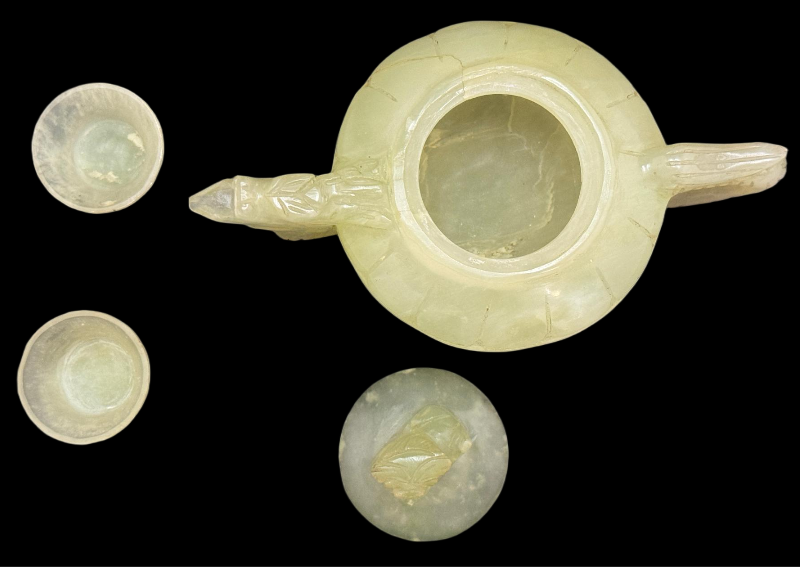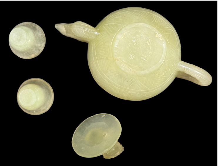 岫巖玉是中國(guó)歷史悠久的玉石品種之一,這套酒具不僅是玉石雕琢工藝的集中體現(xiàn),還承載著中國(guó)傳統(tǒng)酒文化的內(nèi)涵。它將玉石的溫潤(rùn)質(zhì)感與酒具的實(shí)用功能相結(jié)合,既是一件可供賞玩的玉石藝術(shù)品,又是傳統(tǒng)飲酒文化的實(shí)物載體,對(duì)于研究岫巖玉的雕琢工藝、中國(guó)古代酒具的形制演變以及玉石文化與酒文化的融合具有重要意義,是一件兼具藝術(shù)價(jià)值、歷史價(jià)值與收藏價(jià)值的玉石珍品。