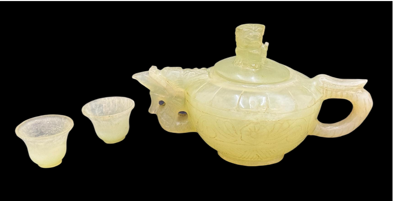 這是一套以岫巖玉為材質(zhì)的酒具,在材質(zhì)特性、工藝雕琢與文化價(jià)值上均展現(xiàn)出獨(dú)特魅力。整套酒具由酒壺與兩只酒杯組成,材質(zhì)為岫巖玉,玉質(zhì)呈淡黃綠色,質(zhì)地溫潤(rùn)細(xì)膩,透明度較好,表面帶有自然的玉質(zhì)紋理,盡顯岫巖玉“溫潤(rùn)似玉、通透如冰”的材質(zhì)特性。酒壺造型設(shè)計(jì)精巧,壺身圓潤(rùn)飽滿,壺嘴雕琢成獸首形態(tài),線條流暢自然,獸首細(xì)節(jié)刻畫生動(dòng);壺把為環(huán)形,便于握持,壺蓋同樣帶有雕刻裝飾,與壺身風(fēng)格統(tǒng)一。兩只酒杯形制小巧,與酒壺搭配協(xié)調(diào),杯身輕薄,體現(xiàn)出玉石雕琢的精湛工藝。