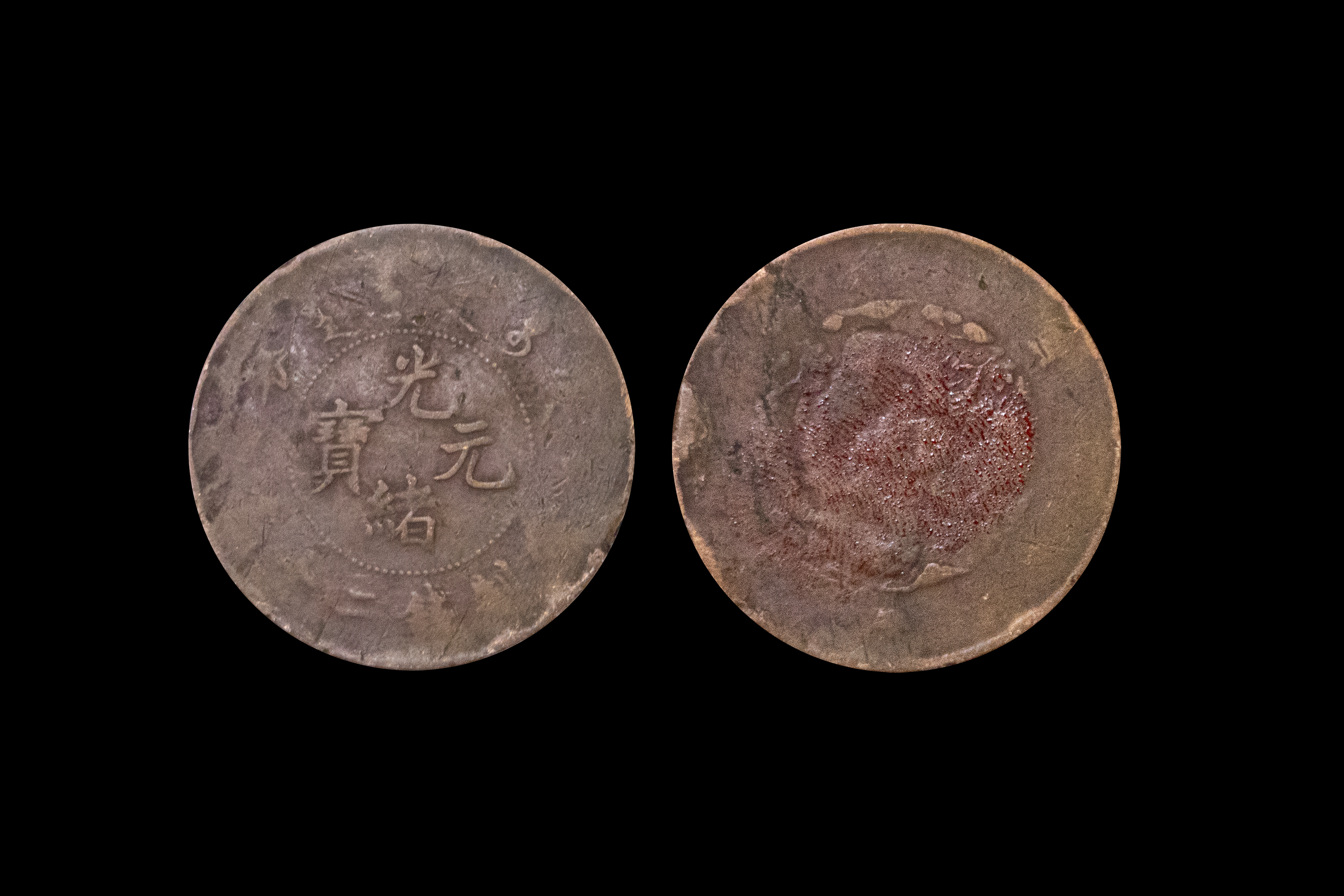 這是一枚光緒元寶當制錢二十文背逆版銅元,是清代晚期機制銅元中極具特殊性的實物遺存,在歷史、工藝與收藏領域都有著獨特價值。它以銅為主要材質鑄造,歷經歲月沉淀,表面形成了厚重的氧化包漿,呈現出棕褐、灰黑等混合色澤,幣面帶有明顯的磨損、銹蝕痕跡,部分區域甚至因長期流通出現了凹凸不平的狀況,這些痕跡如同一部微觀的歷史檔案,生動記錄了它在歲月流轉中的使用與保存歷程,盡顯古樸滄桑的歲月質感。錢幣整體呈圓形,邊緣規整,厚度均勻,雖因年代久遠在細節處有所損耗,但仍能體現清代晚期機制銅元鑄造工藝的基本水準。